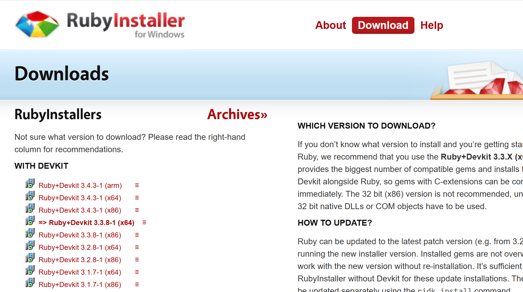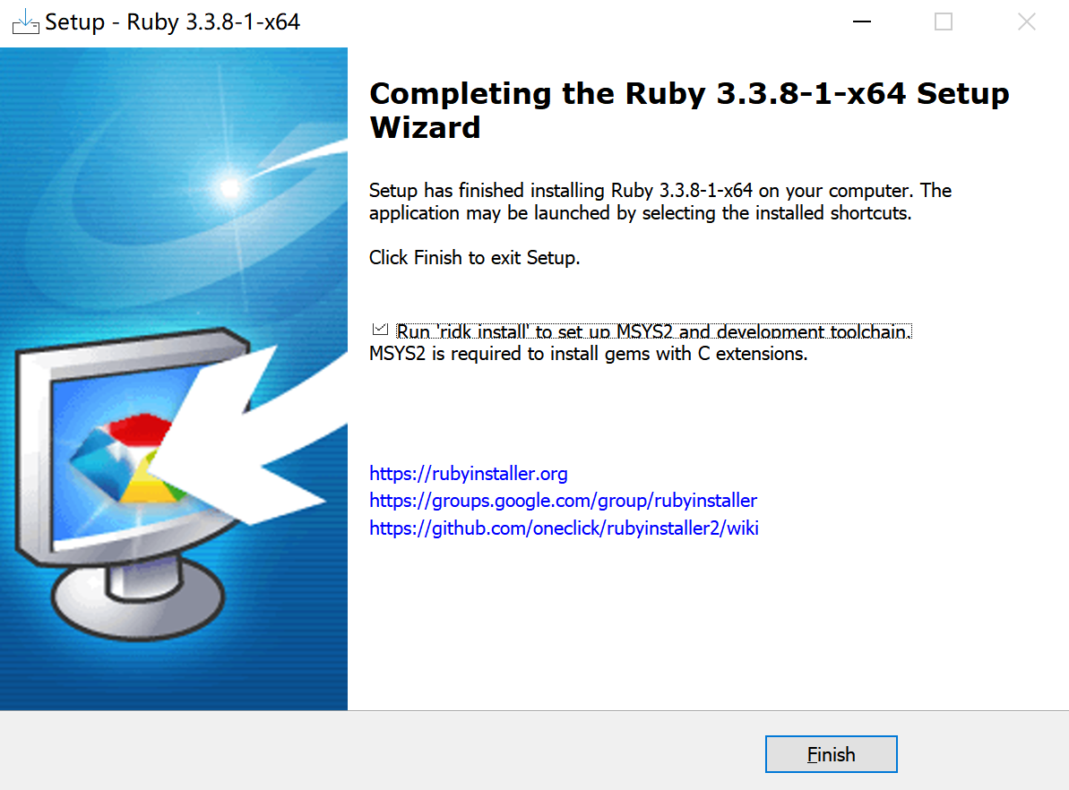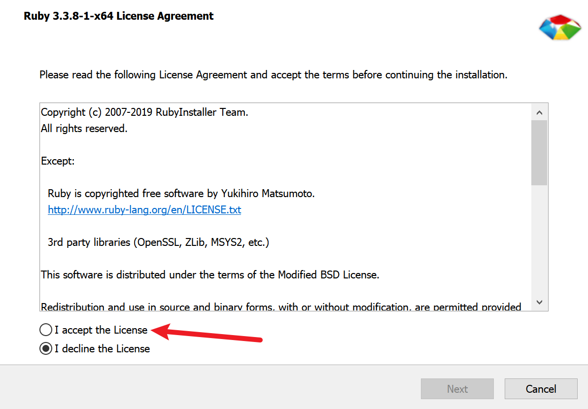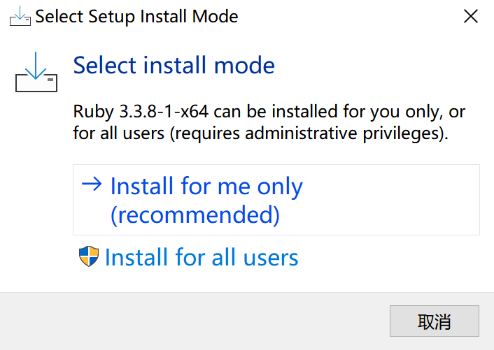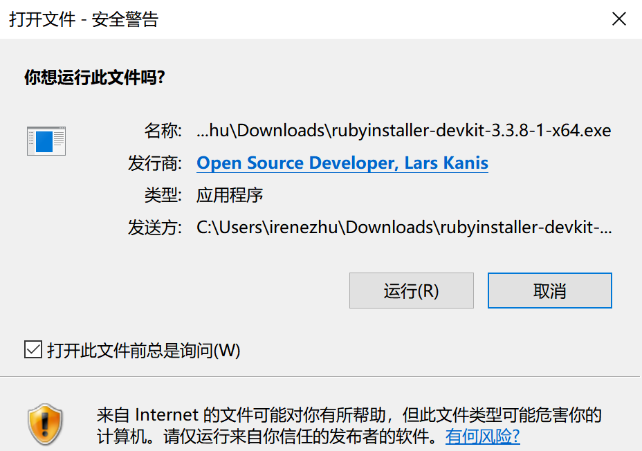 去官网RubyInstaller.org 下载Ruby+Devkit,并运行下载好的.exe文件: