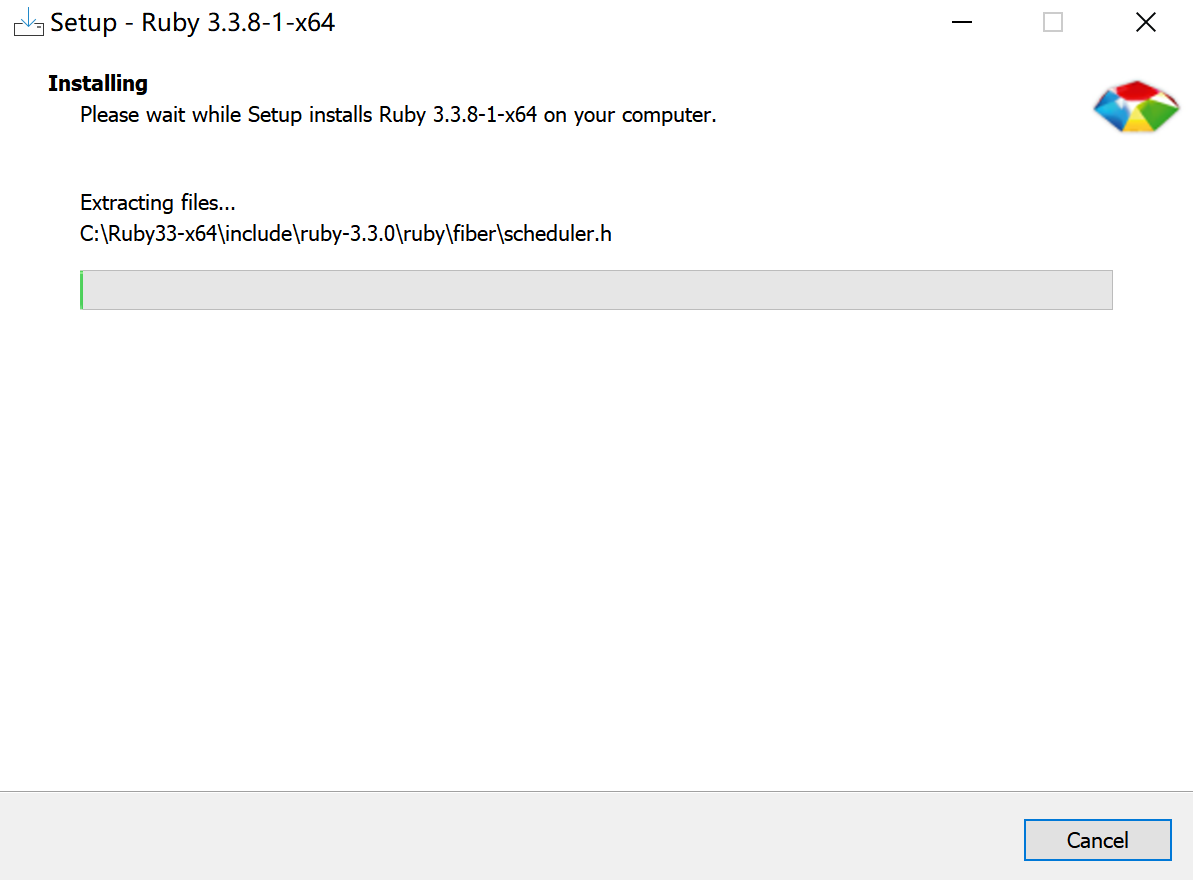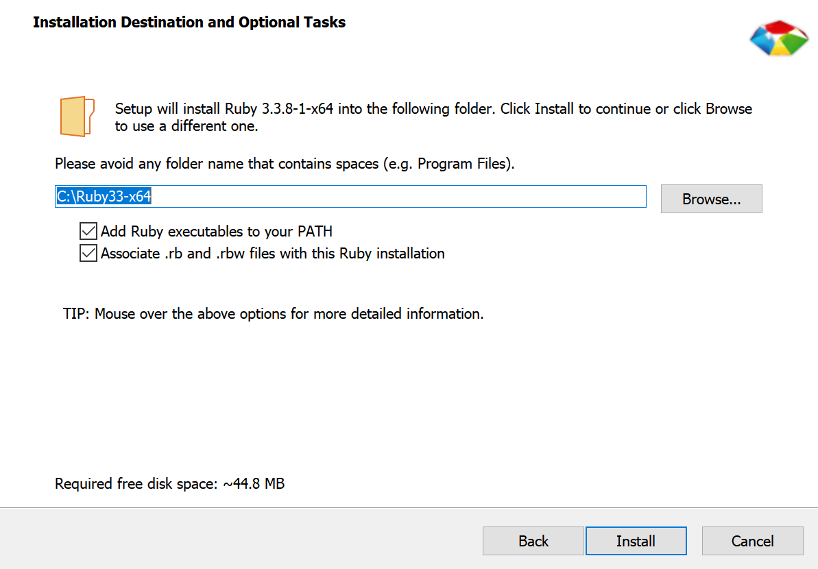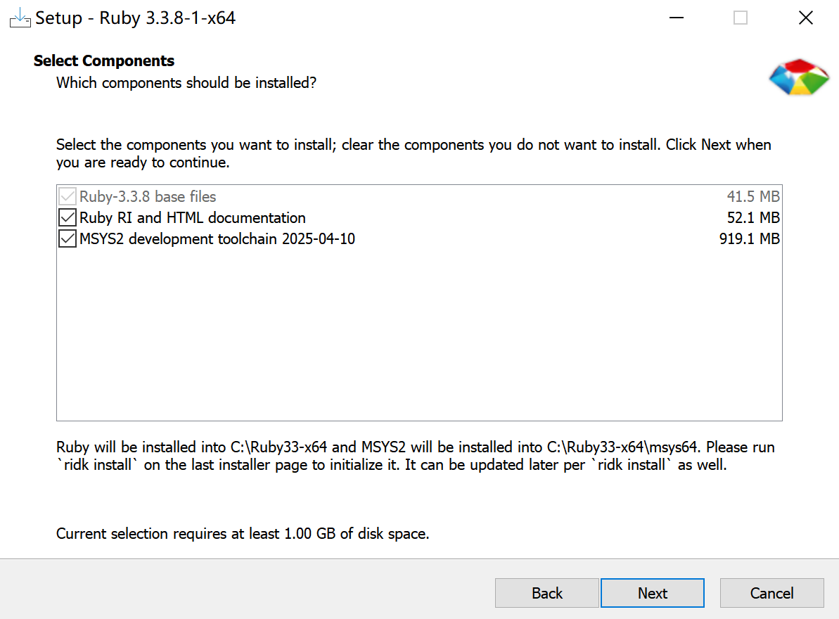 去官网RubyInstaller.org 下载Ruby+Devkit,并运行下载好的.exe文件: