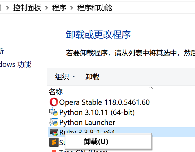 控制面板->卸载程序->