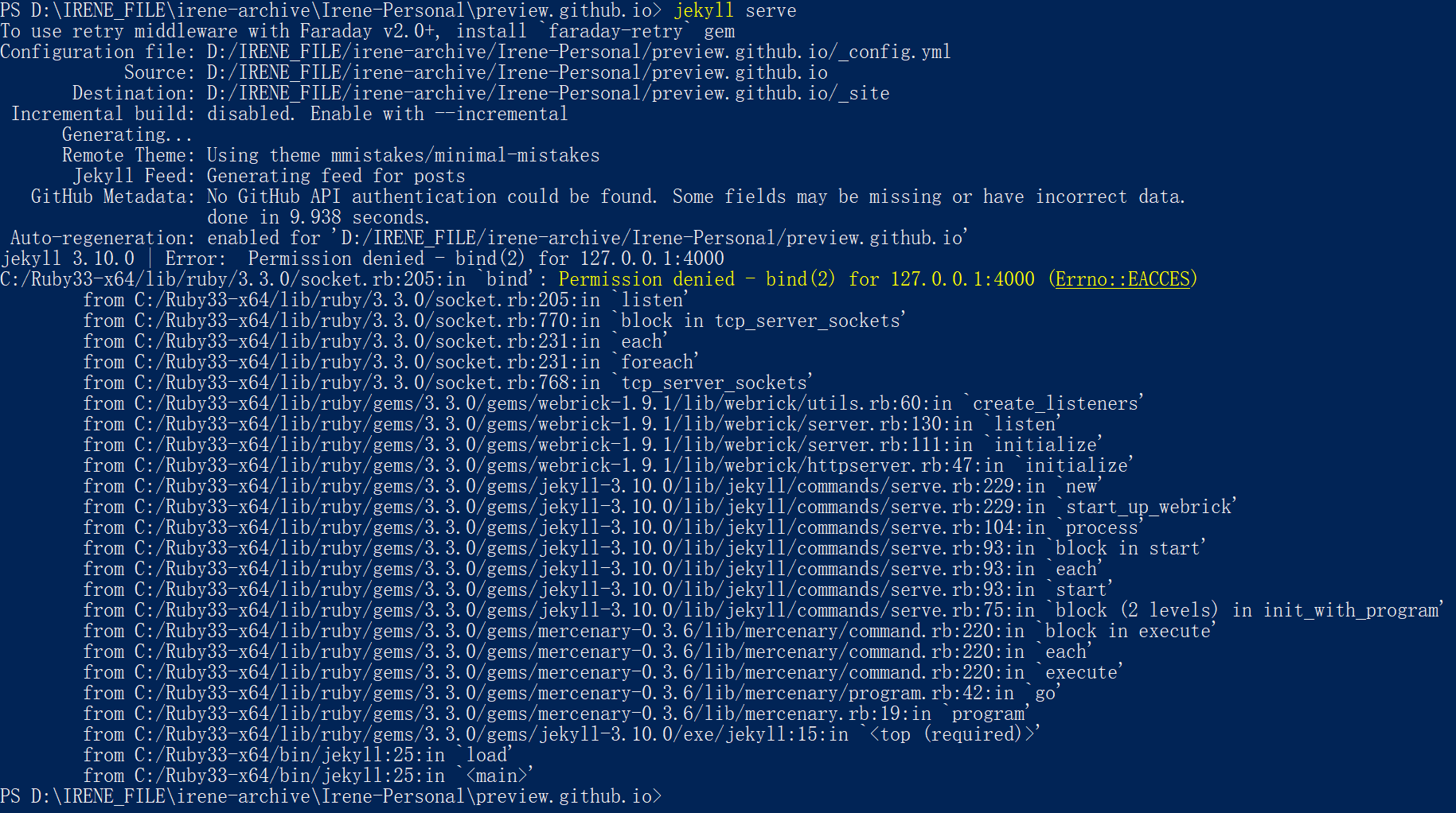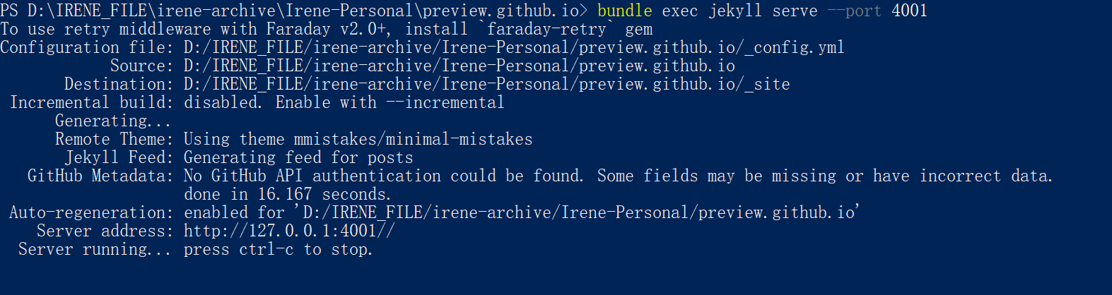 c. 此时运行Jekyll serve就可以了。有一种情况是原来的默认端口被占用了:
