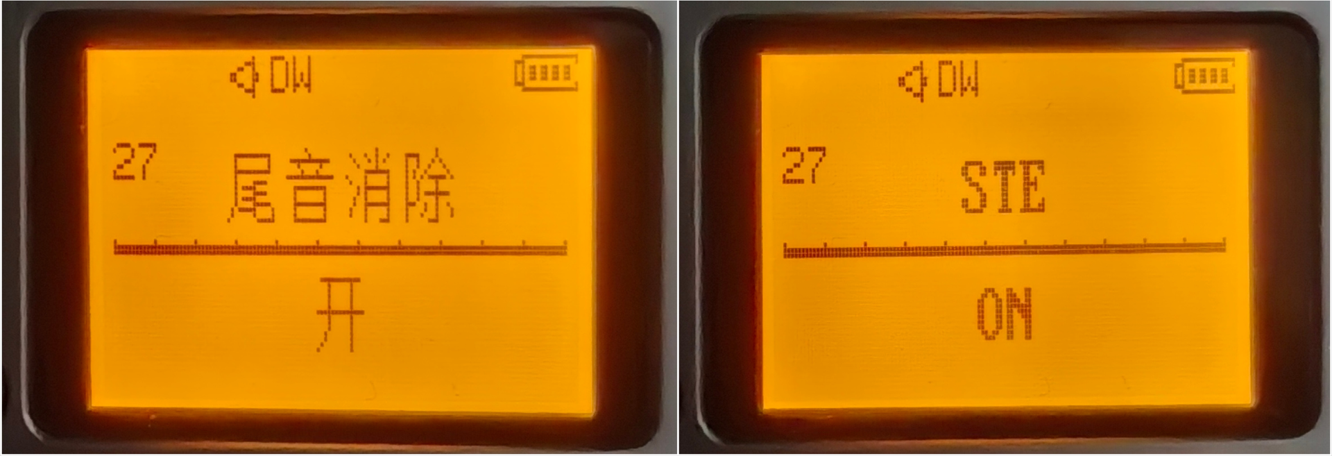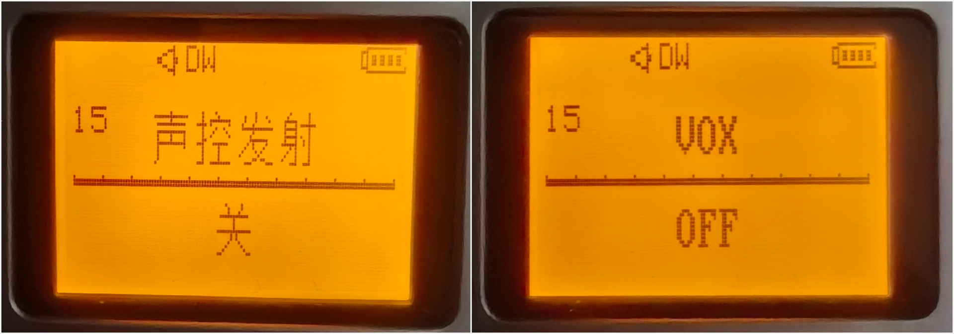 如果打开(屏幕上也会显示VOX),则可以选择灵敏度,数字越低越灵敏,数字越高,越不容易误发射话音。这个依据环境音来调整。