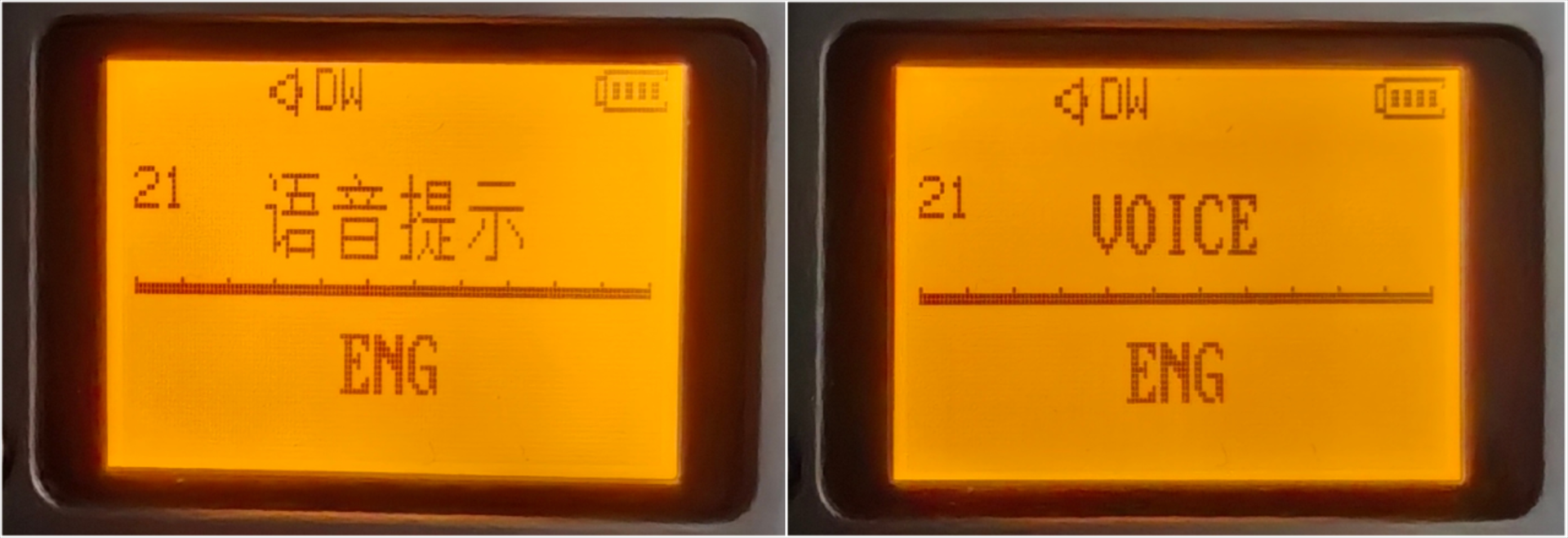 就是中英的语音,这个和菜单项50-语言选择在区别是50-语言选择设置的是显示界面的语言,这里21语音提示是语音的语言,不是同步的,所以要分别设置。
