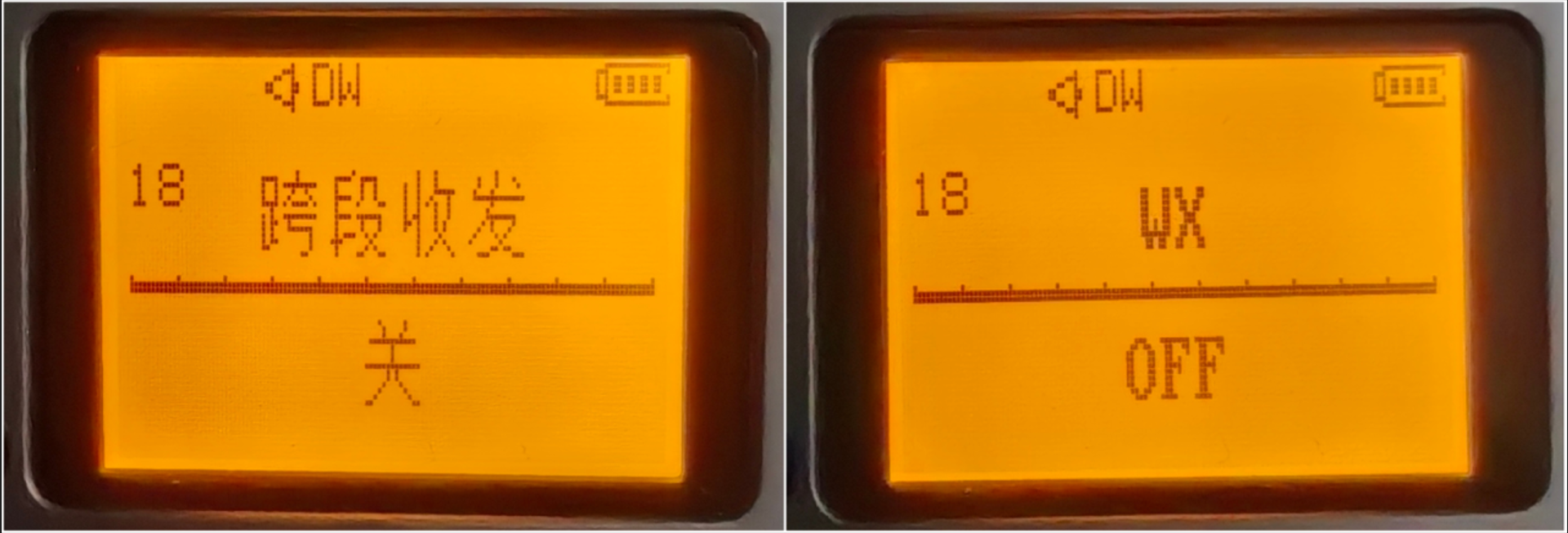 这个功能有点像双守候,但区别是跨段收发会强制使得信道A和B分别承担发射和接收的工作(从屏幕上看,实心箭头是本台发射的那一个信道)——也就是说,这个菜单项选择的是默认的发射信道,剩下的另一个没被选的就会默认为接收信道。