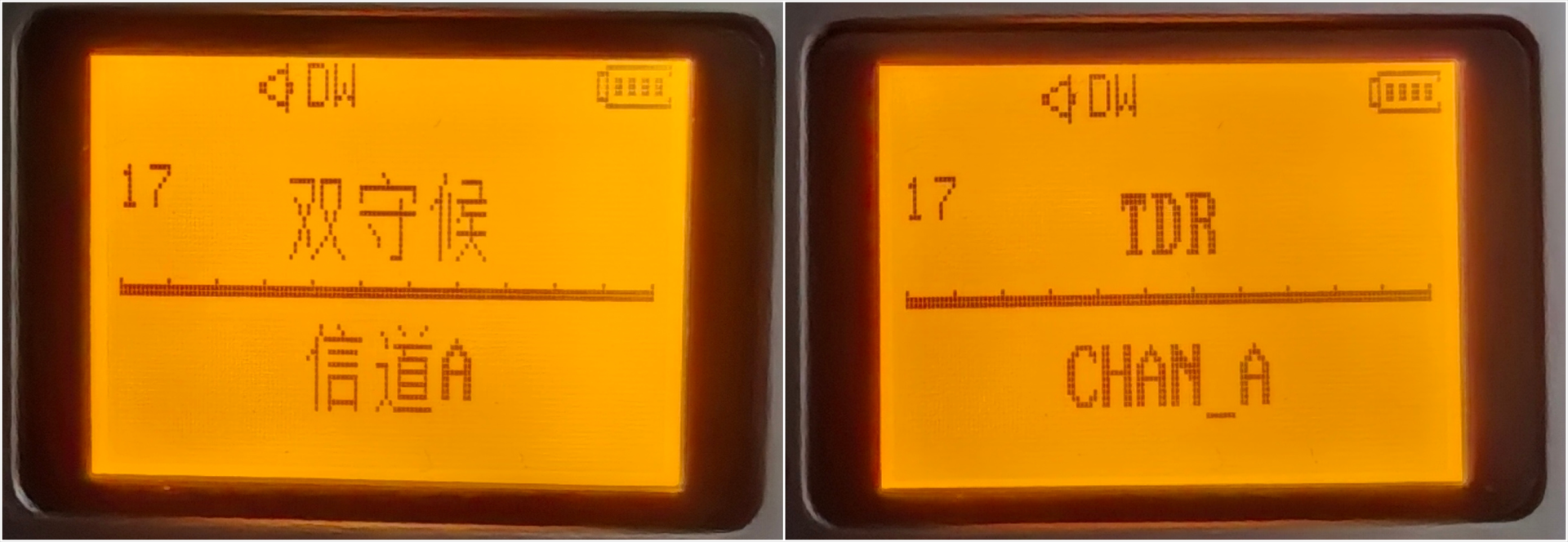 但如果在此菜单打开双守候的话(不论是设置成默认“信道A”还是“信道B”),两个信道都会去守,且非默认的那一个信道过来信号时,及时按下PPT,可以即时在这个非默认信道上通话的。<-注意,这个要和跨段收发做区分