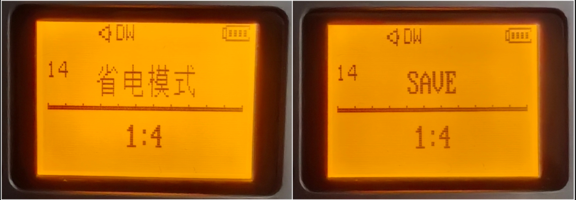 默认是1:4。1:4的意思就是说把整个手台的待机时间分为4份,其中扫描信道的时间占1份,另外3份时间处于待机休眠状态。如果是OFF的话,手台就会连续守听,不遗漏任何一个信号,但会费电。