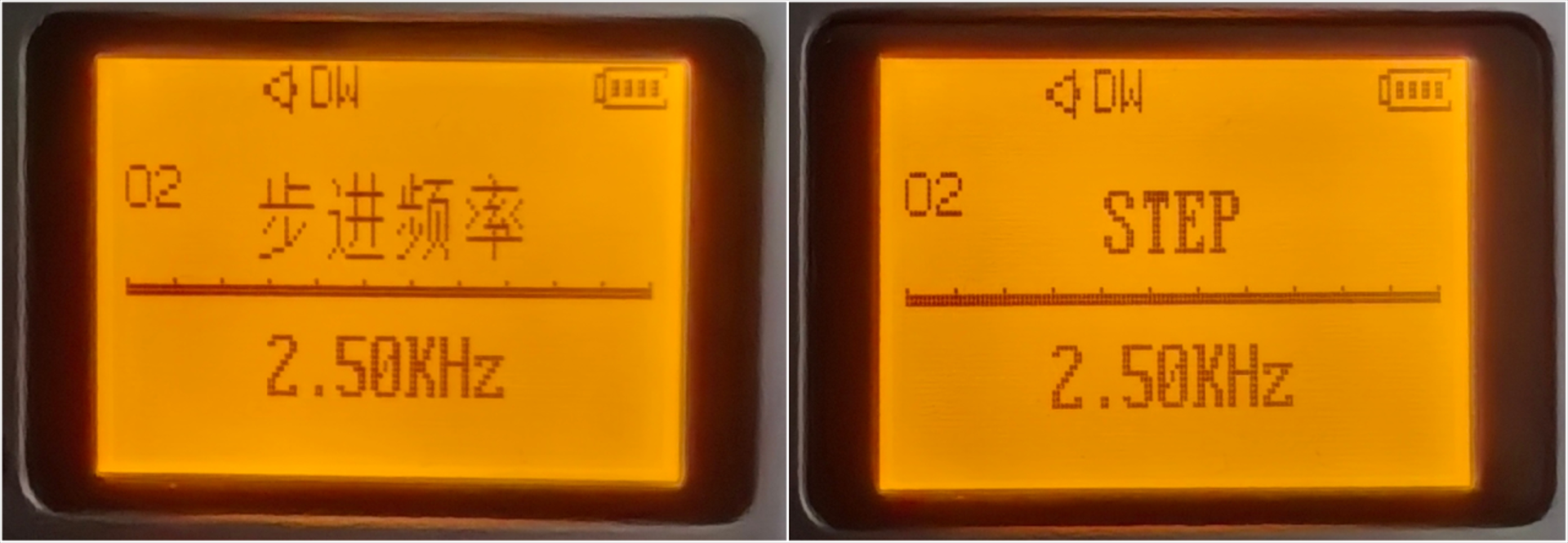 这个是用来设定频率模式下的调节间隔。选为2.5k比较方便。如步进频率25kHz,则用上下键调频时,每次的间隔会是25kHz