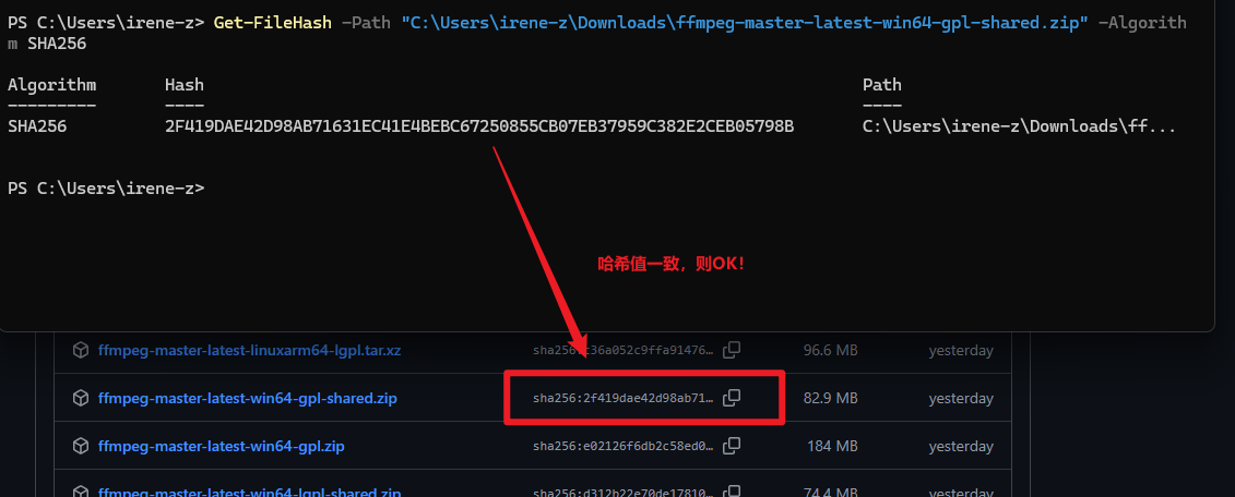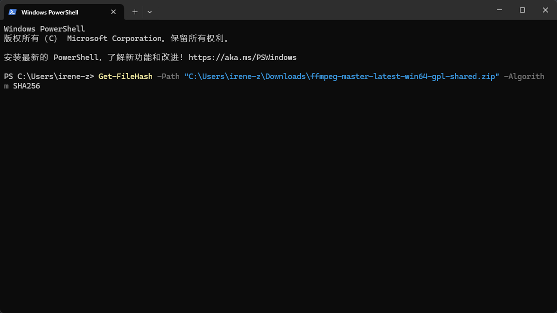 Get-FileHash -Path "C:\Users\irene-z\Downloads\ffmpeg-master-latest-win64-gpl-shared.zip" -Algorithm SHA256: