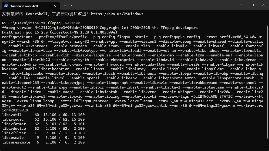 至此,如在命令行中输入:ffmpeg -version,应有版本输出,说明安装成功