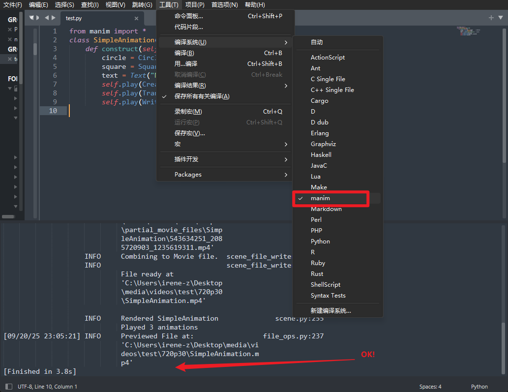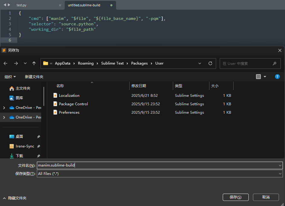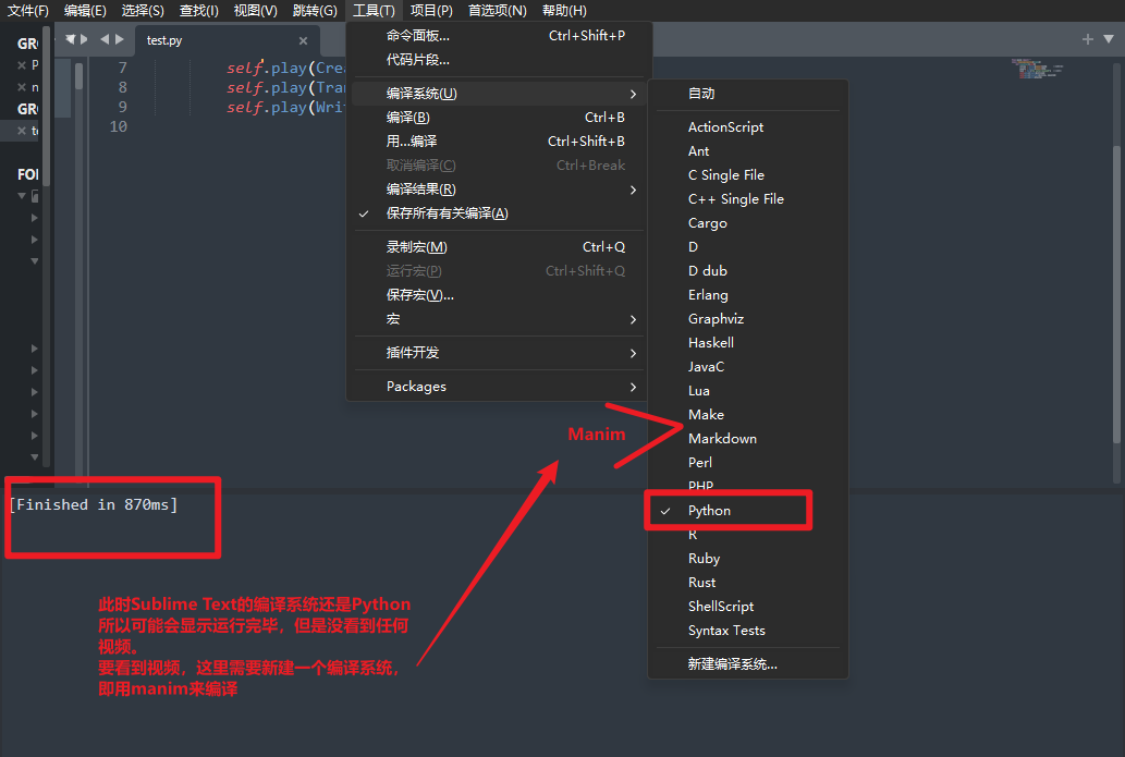 所以此时比较方便的方式是直接在sublime text中构建一个新的编译系统,给manim用: